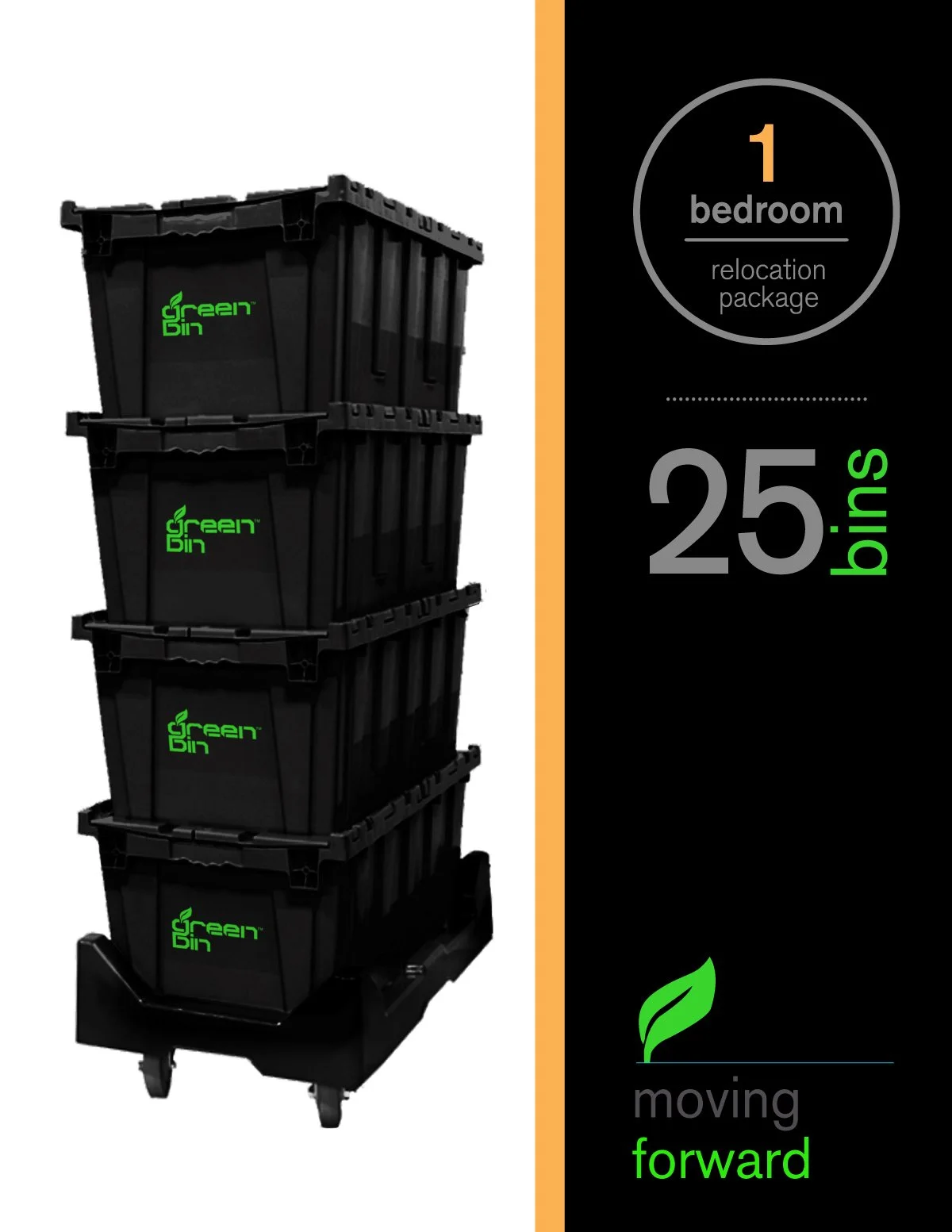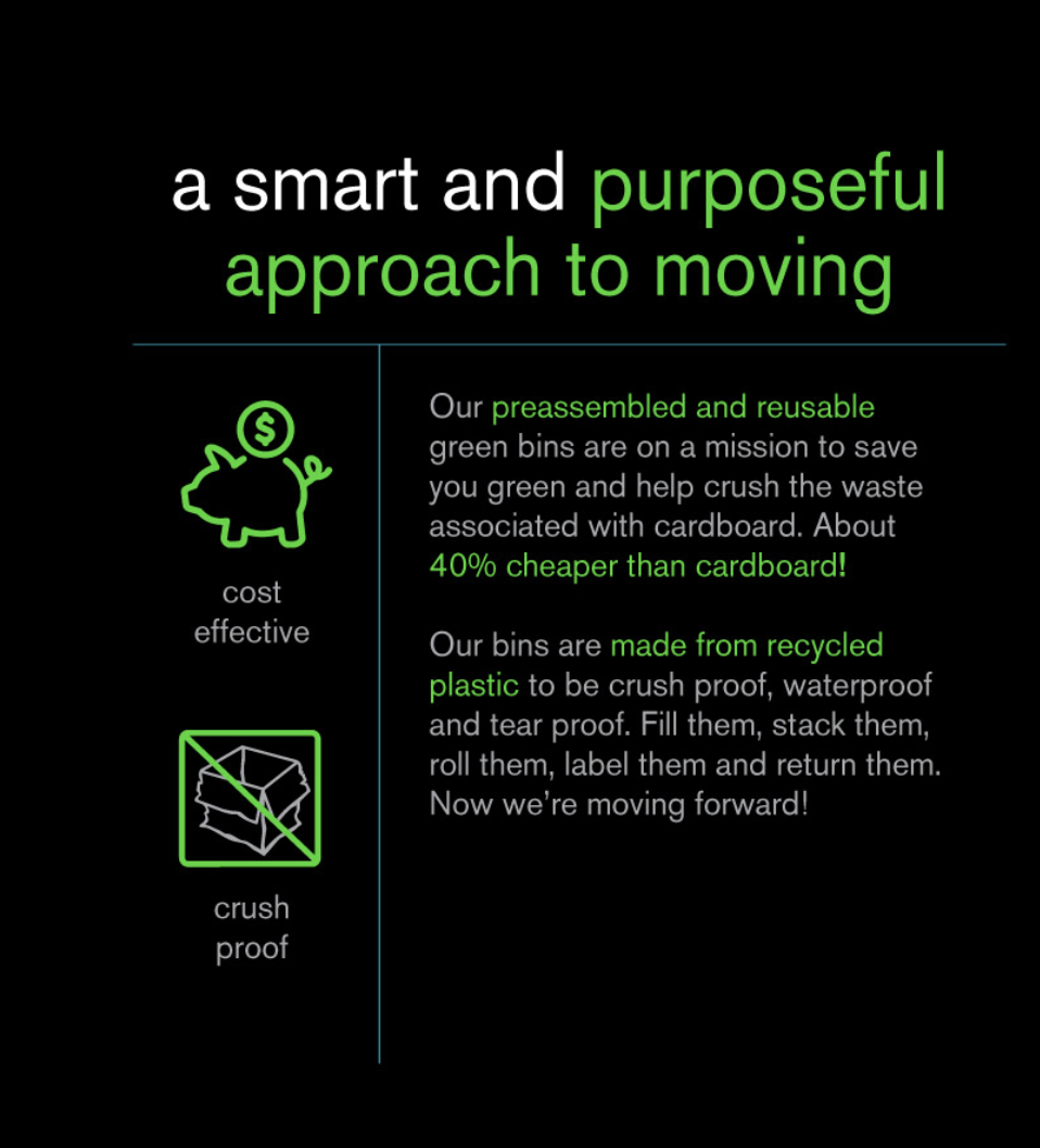 The Green Bin is a smart and purposeful approach to moving with recycled high quality plastic moving bins. Preassembled and reusable, TGB is on a mission to help you save by renting plastic boxes instead of the common waste associated with using traditional cardboard moving boxes. Crush proof, waterproof and tear proof the recycled plastic Green Bins can be filled, stacked, rolled, labeled and then returned.